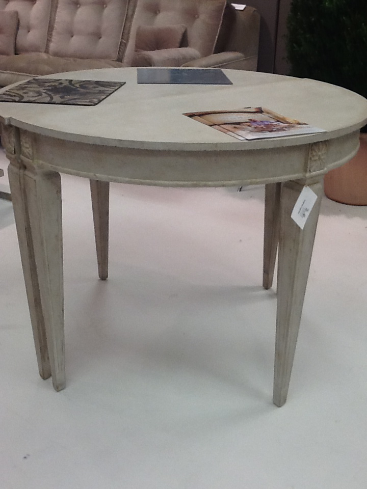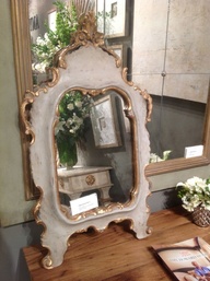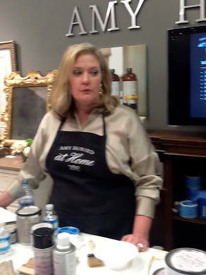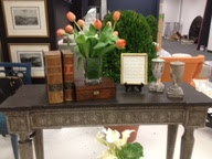 I'll give you some notes ahead of the pictures! The first picture is of a drop dead gorgeous leather antique settee, oh my goodness, I would love to have strapped it to the roof of my car! :). In another room with pretty pink decor, I loved the contemporary art piece the designer said he had commissioned for the room. The kitchen is a very small L-shaped room and the designer had beautiful rustic cabinetry installed as well as in-laid stone concrete floors, and neutral walls. Turquoise and black caught my eye in the next room with a beautiful iron table and glass top. That could surly come home with me too! I loved the contemporary design, my mind doesn't think that way, but I really liked it. I was happy to meet architect Bill Ingram whose work I have followed for quite some time. He and and his design partner had a beautiful warm space. Those of you that know me know there is no such thing as too many mirrors, and his was spectacular! Sherry and Lori had a warm space as well. The ceiling (which I didn't get a picture of) was covered in a beautifully stained wood that blended with the natural hues of the stone walls on one side and dark painted walls on the other. The small gallery of pictures contrasts nicely with the painted walls. Their creativity shone through with the vignettes they created. The dining room had a skirted table with the most gorgeous fabric against one wall, and lovely china and monogrammed napkins set a beautiful table.